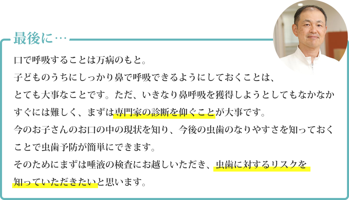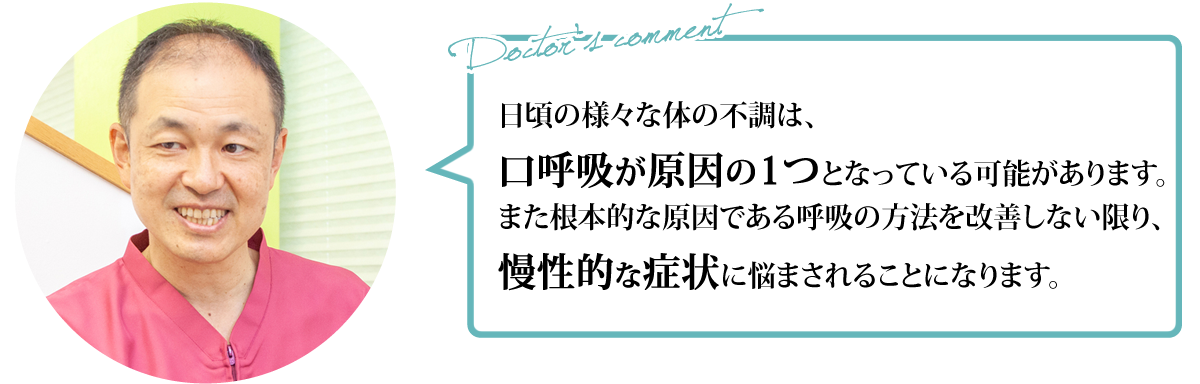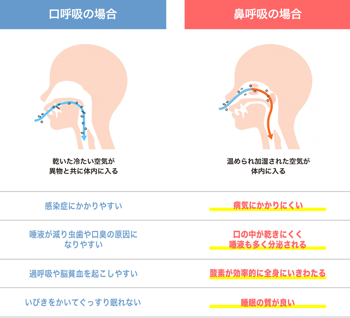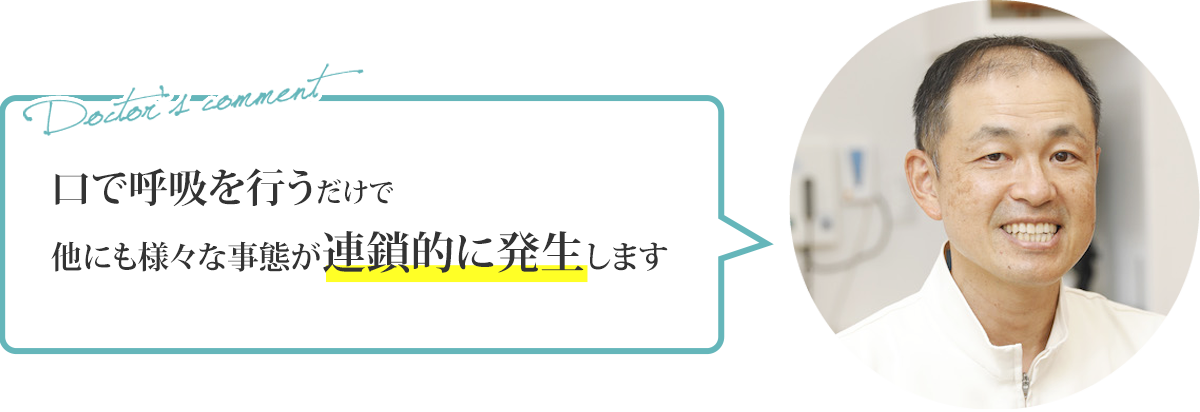 - 口が乾き、乾いた空気が直接のどに入り込むことで、風邪を引きやすく、虫歯や歯周病になります。